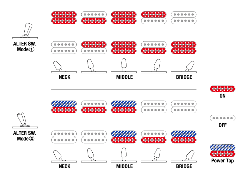dyna-MIX10スイッチングシステムとアルタースイッチにより、ハムバッカーモードとシングルコイルモードを簡単に切り替えることができ、10種類のサウンドバリエーションを楽しむことができます。特にパワータップモードでは、片方のコイルをタップさせ、もう片方のコイルの低音域を生かす特殊な配線が施されており、クリアで太いサウンドを実現します。