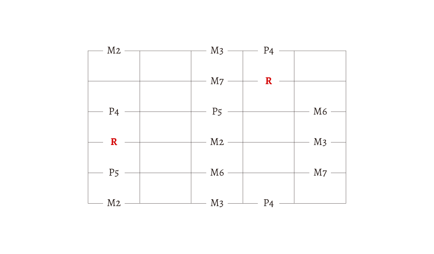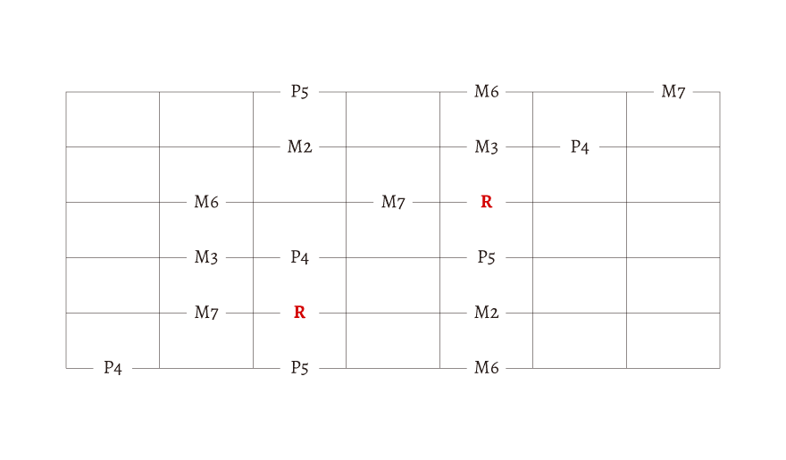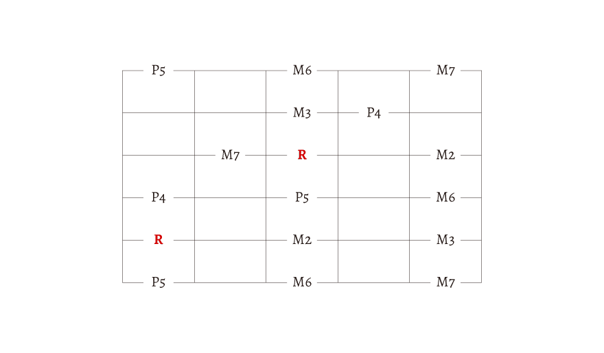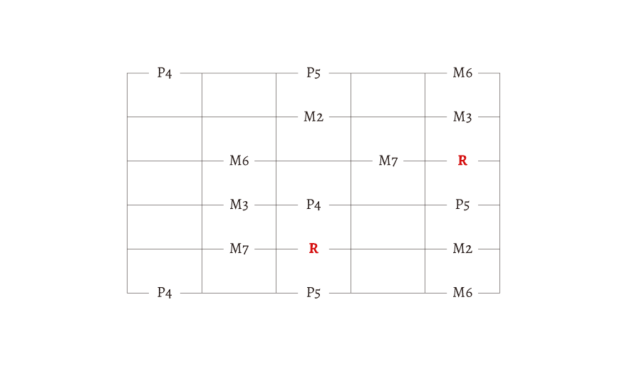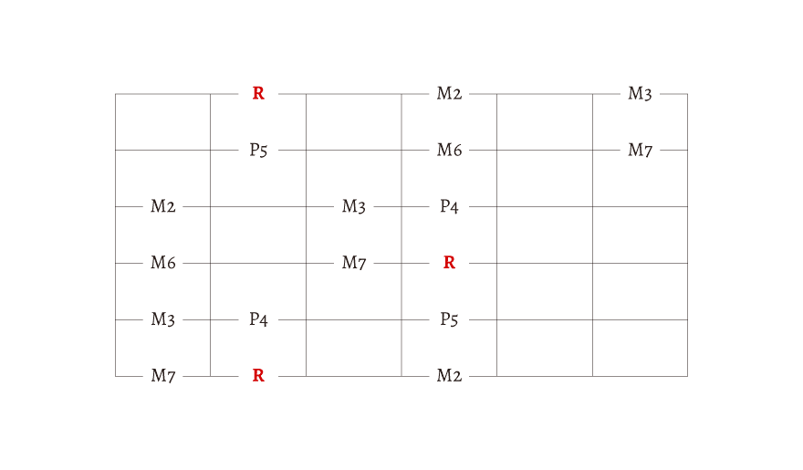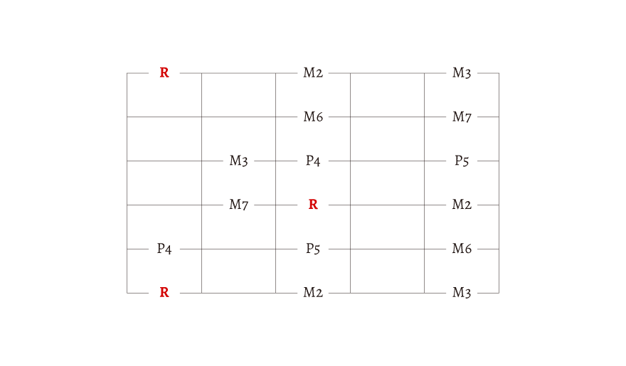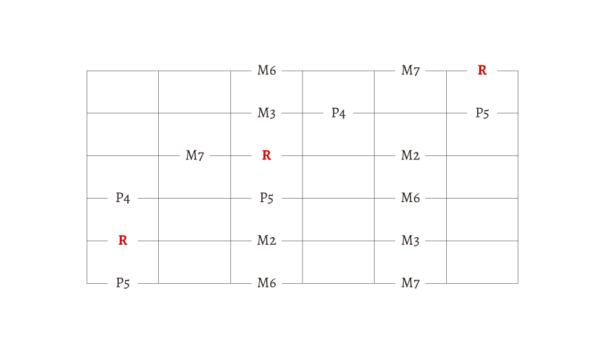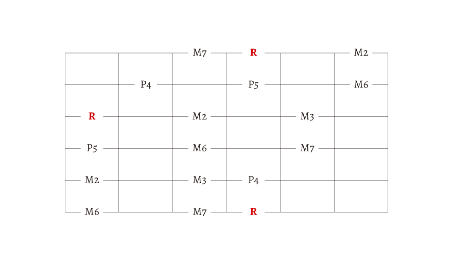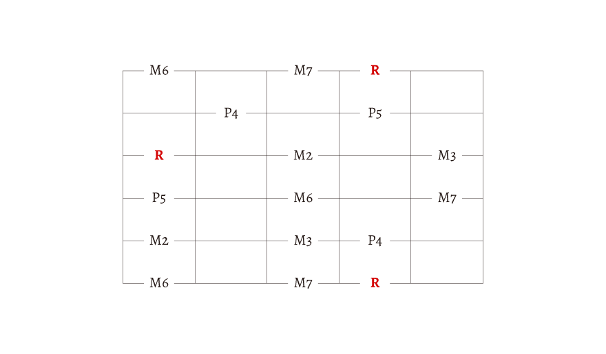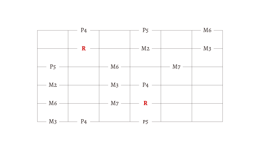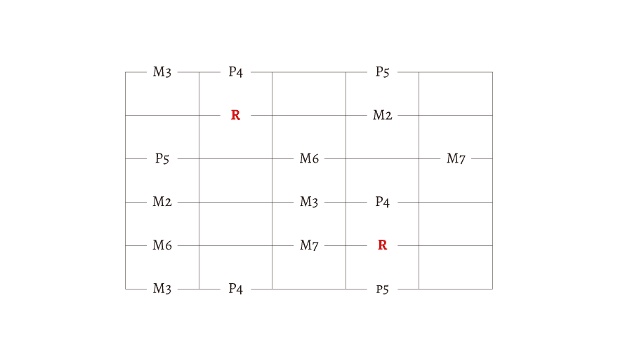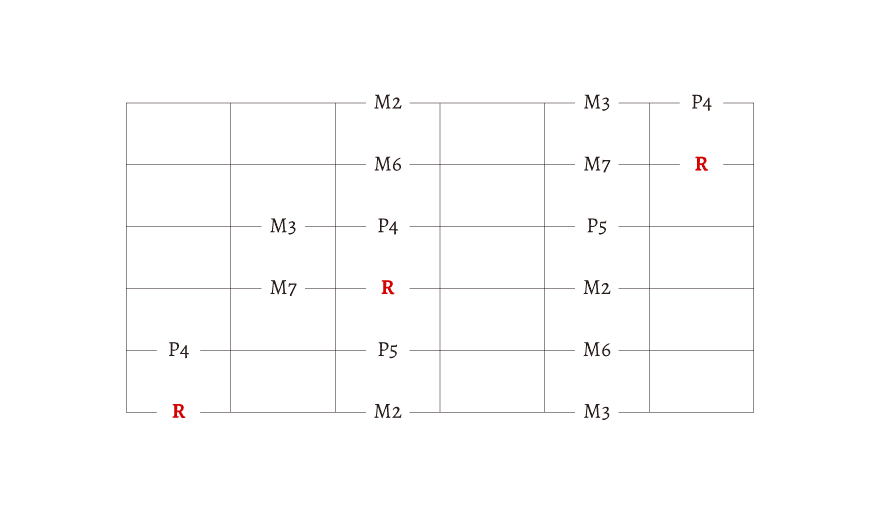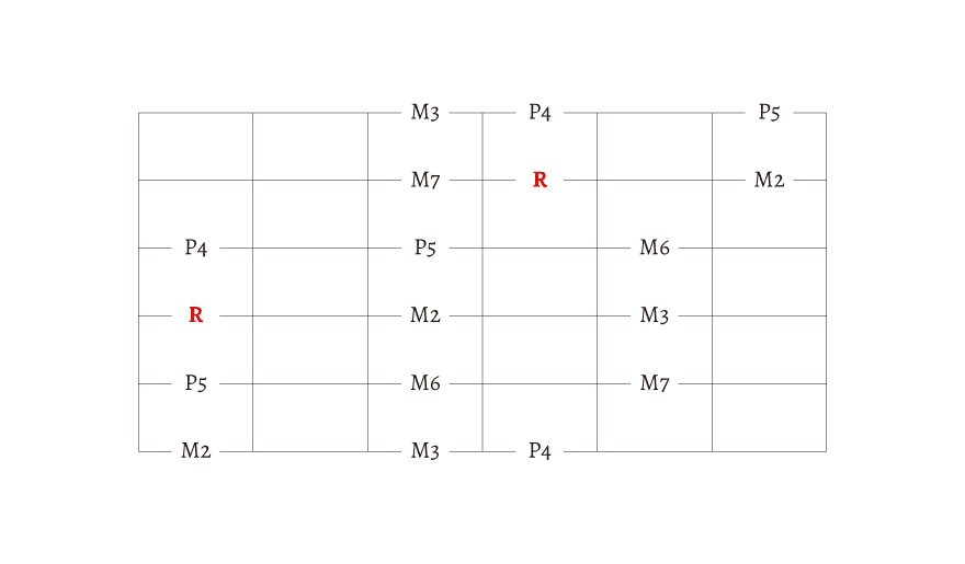 R とか M2、M3 とか書いてありますが、わからない人は無視しても大丈夫です。この文字の理解には「音程」の知識が必要になります。今は、始まりの音が「R」だということだけを覚えておきましょう。